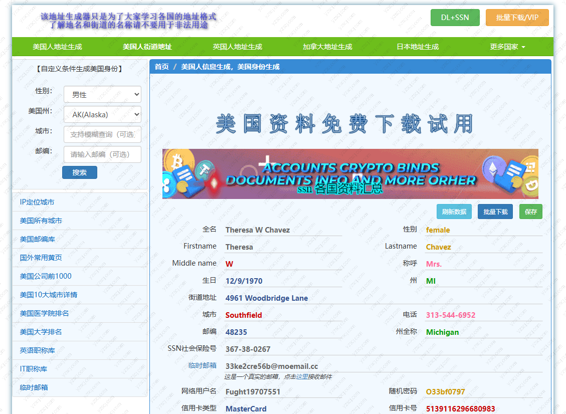 随机生成美国,英国,日本等国身份,包括姓名,地址,电话,职称,信用卡,身高,体重等信息,获取美国人信息,获取美国人地址生成器。