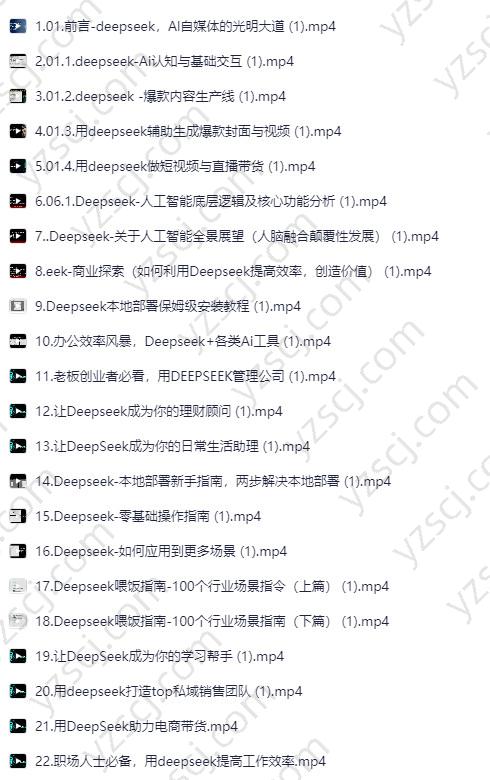 AI认知与基础:了解Deepseek的人工智能逻辑与应用场景,打通AI思维方式。内容创作与自媒体:掌握爆款内容生产线、短视频与直播带货技巧,快速生成封面、视频和脚本。办公与创业管理:利用Deepseek搭建高效团队,提高办公效率,辅助公司管理与决策。电商与私域流量:打造私域销售团队,应用AI助力电商带货,实现精准营销。个人助手功能:从理财顾问到学习助手,再到日常生活助理,覆盖多样化应用需求。本地部署与技术操作:提供安装教程、API调用、知识库搭建及提示词技巧,降低技术门槛。行业应用拓展:涵盖100个行业场景的实用指令,支持思维导图、行业分析等高阶应用。