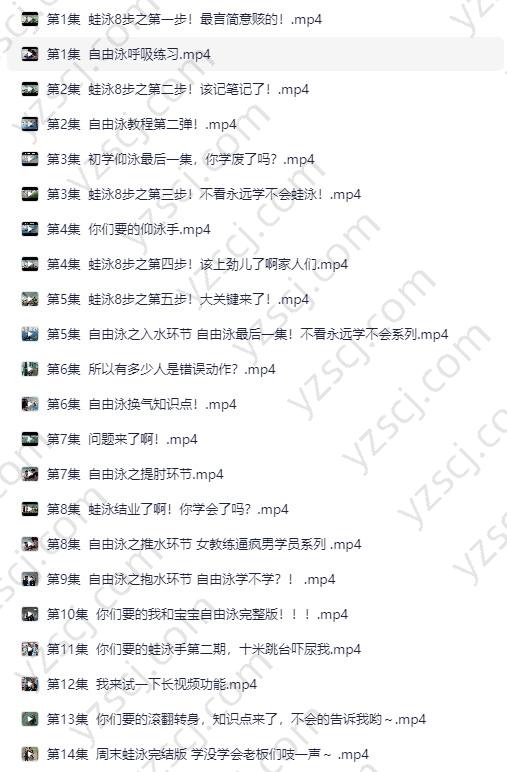 自由泳篇:呼吸、入水、推水、抱水、提肘、换气等分解动作,逐步完成完整泳姿。仰泳篇:五步学习法,从基础呼吸到手脚配合,帮助初学者快速上手。蛙泳篇:完整“8步教学”,覆盖手脚分解、换气与同步训练。蝶泳篇:腿部与手部分解、动作配合、常见错误解析。花样游泳与延伸:基础托举、花泳展示,以及泳池趣味教学环节。实用技巧篇:应对呛水与抽筋、防水化妆选择、特殊生理期下水安全。